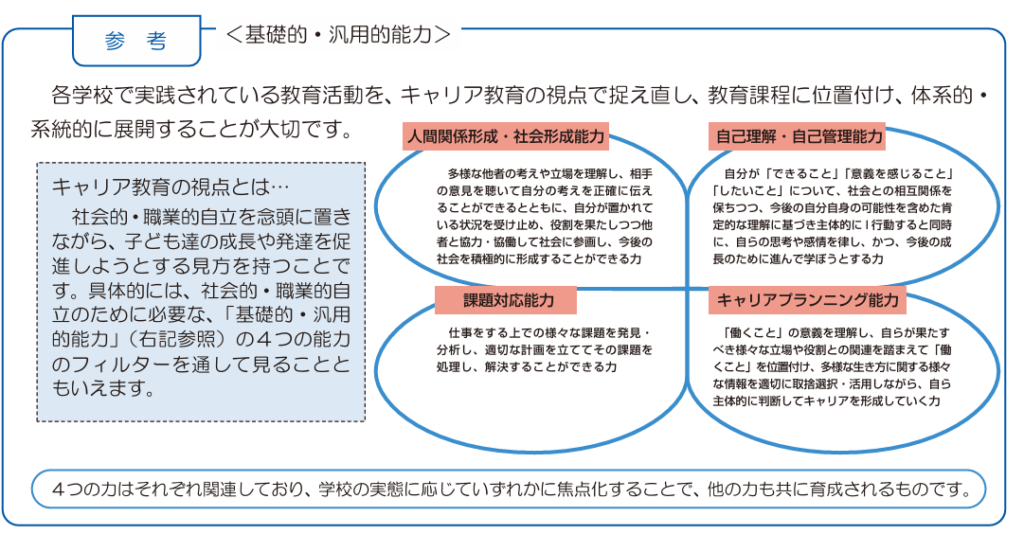 それらの資料を一通り閲覧し動画も見た中でTOMONI Careerが気づいたことがあります。兵庫県教育委員会の資料によれば、キャリア教育では、以下の4つについての教育学習をすることを推進しています。